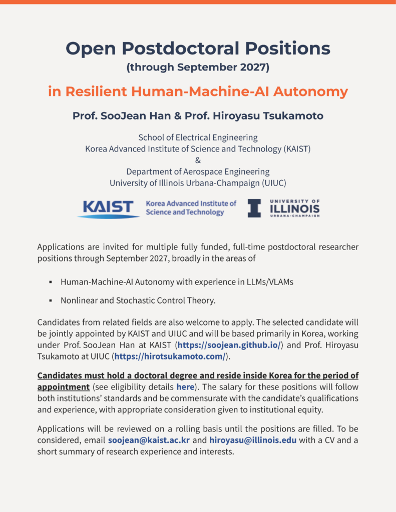 The selected candidate will be jointly appointed by KAIST and UIUC and will be based primarily in Korea, working under Prof. SooJean Han and Prof. Hiroyasu Tsukamoto